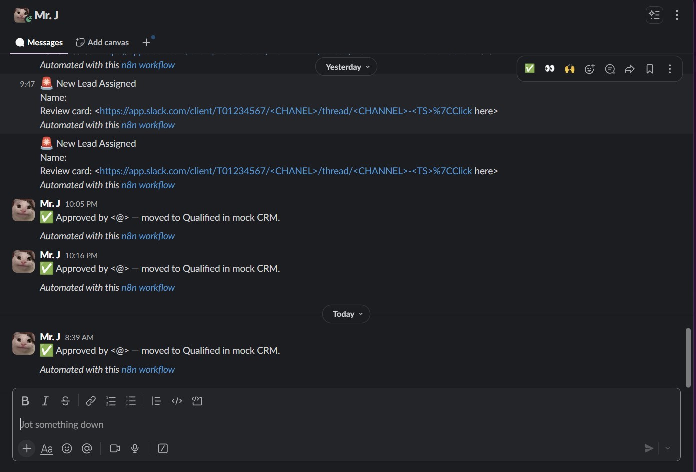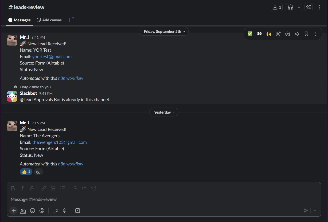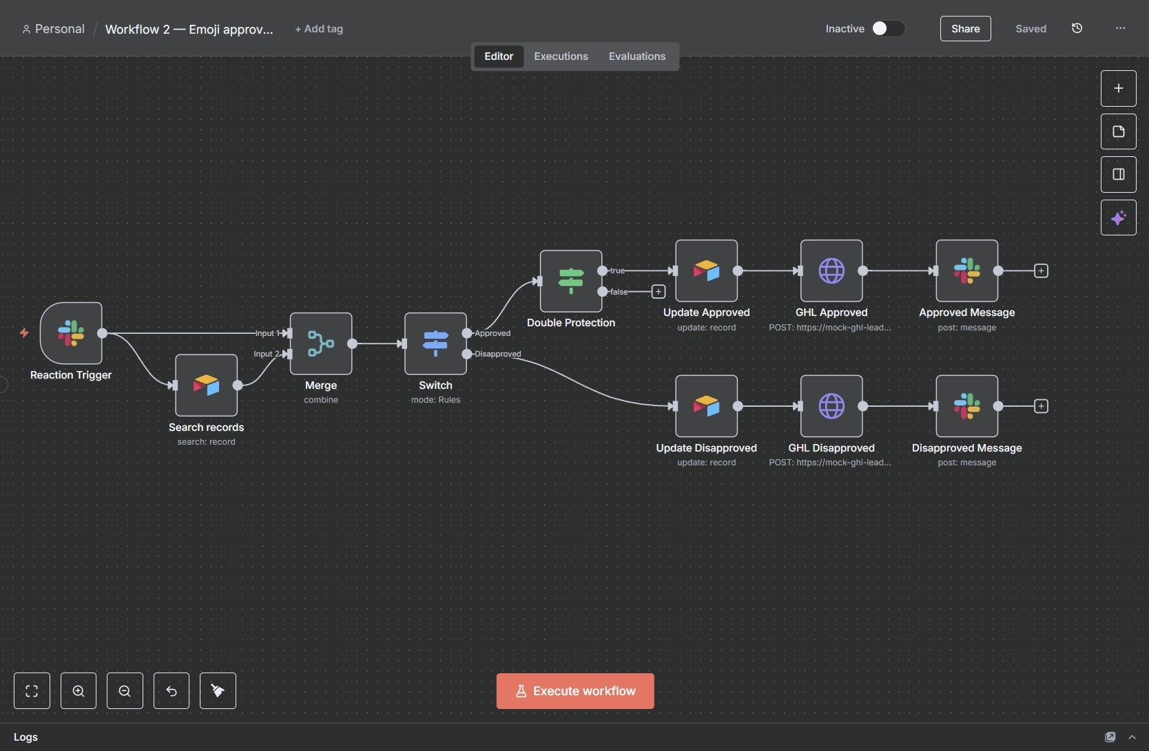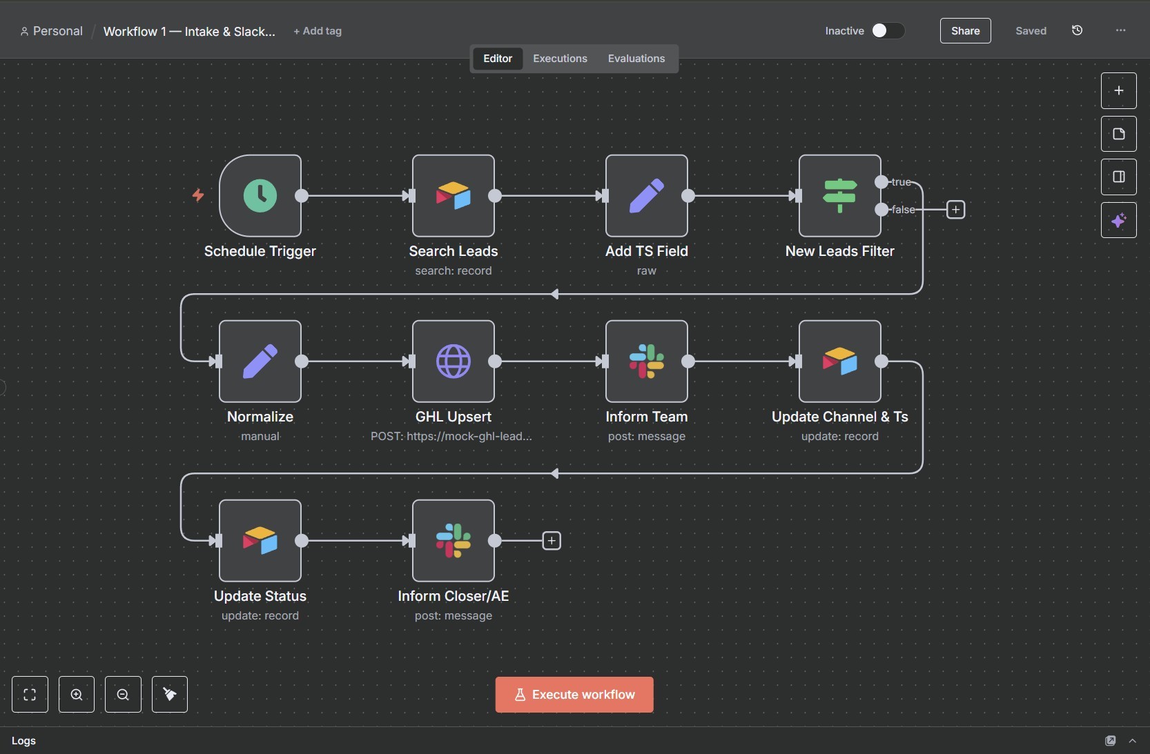 Built a multi-platform workflow (Airtable → Slack → HighLevel) using n8n. New leads auto-sync to Slack for one-click emoji approvals, then update Airtable + GHL in real time. Faced and solved challenges with API authentication, Slack event handling, and data normalization across platforms. The system eliminates repetitive manual updates, ensures accurate CRM data, and gives teams a clear audit trail for every decision. Designed with scalability in mind, it can be easily adapted to other CRMs or messaging platforms.